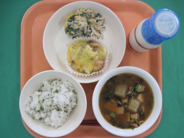 明日11月8日は語呂合わせで「いい歯の日」として、生涯自分の歯で食べ物を食べる楽しみを味わえるようにという願いをこめて決められています。今日は1日早く、強い歯をつくるために必要なカルシウムがたくさんとれる献立にしました。秋鮭とポテトのチーズ焼きの鮭やチーズ、カル鉄サラダの切り干し大根、そして毎日の給食で出る牛乳とカルシウムたっぷりの食品を使いました。カルシウムは成長期の今しっかりとることが大切です。ご家庭でも積極的にカルシウムをとって強い歯をつくりましょう。