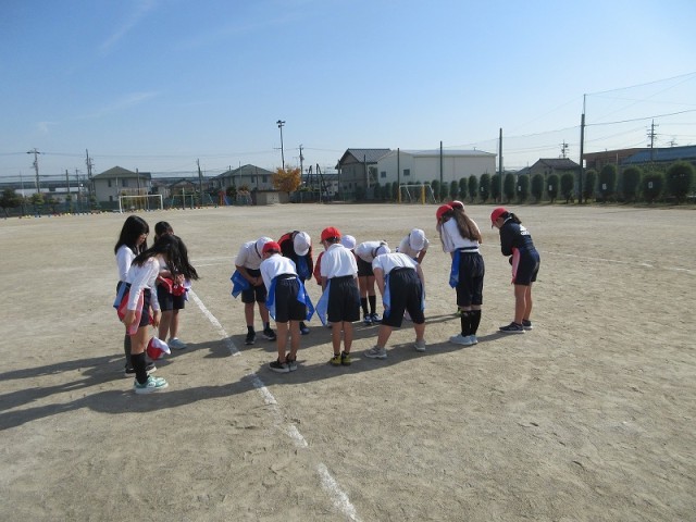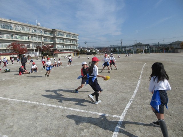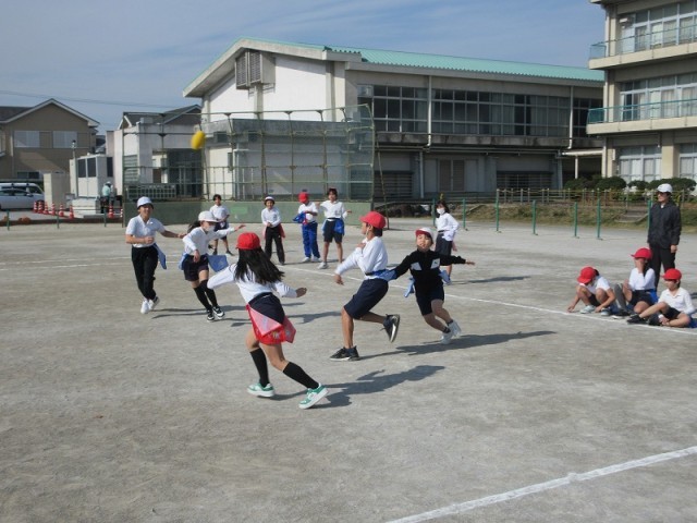 ゴール型ゲームの学習として「フラッグフットボール」を行っています。