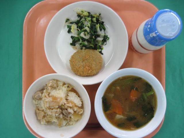 キムタクご飯 牛乳 里芋コロッケ 土佐和え 冬野菜の味噌汁