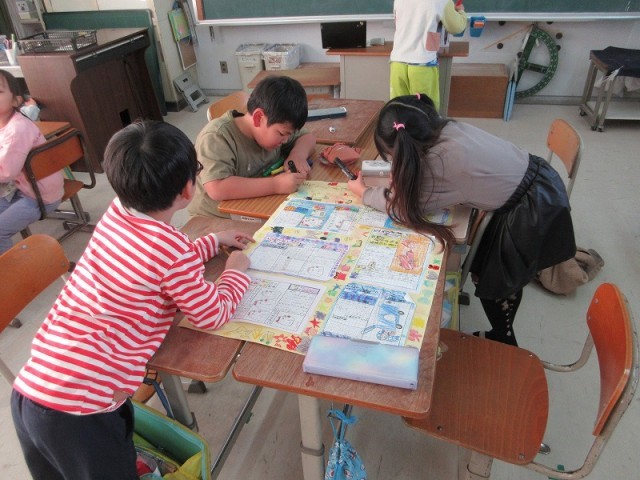 2年生「町探検」の発表準備 公開日 2025/12/15 更新日 2025/12/15 2年生 11月に実施した生活科「町探検」のまとめを行っています。グループのメンバーで協力し、発表会に向けた作業を進めています。大きな模造紙に写真や文書をレイアウトした新聞が完成に近づいています。 いいね(0)