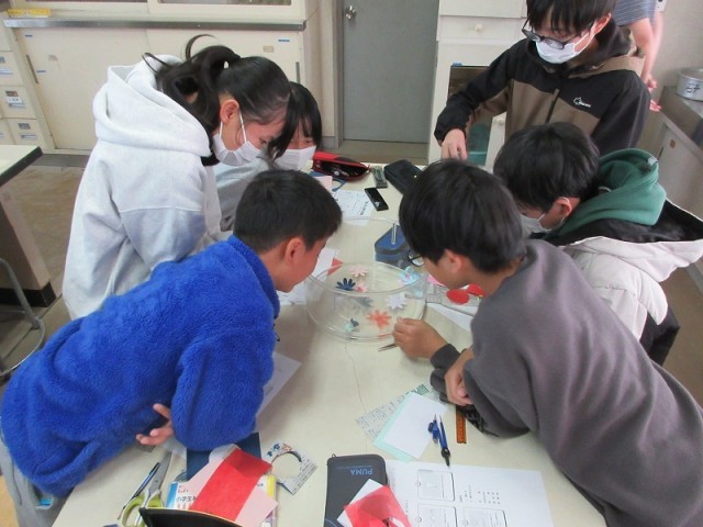 手元に集中して作業をしたり、身を乗り出して変化の様子を観察したりしていました。
