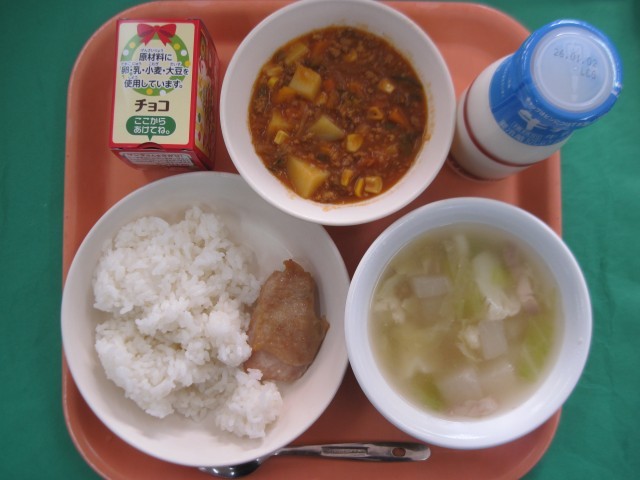 ご飯 牛乳 ★野菜が苦手な子も食べられる!?ドライカレー チキンのガーリック焼き 白いミネストローネ クリスマスチョコケーキ