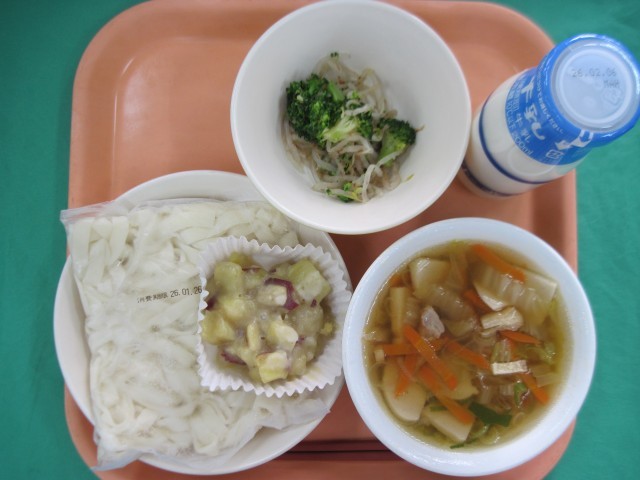 きしめん 牛乳 五目きしめんの汁 ブロッコリーのおかか和え 鬼まんじゅう