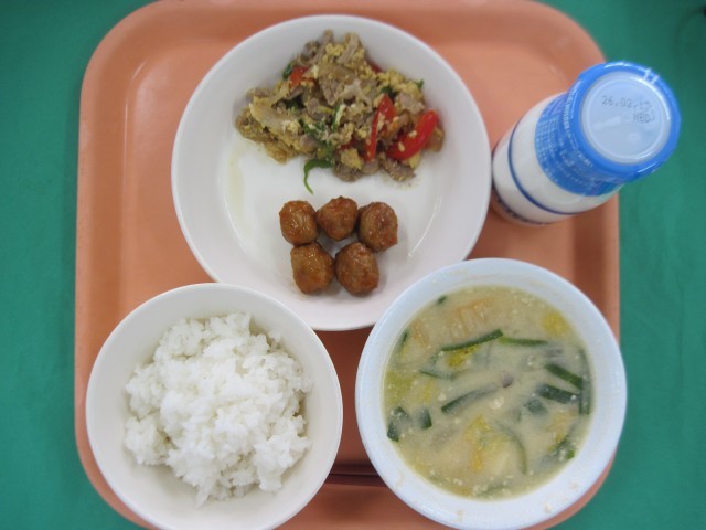 ご飯 牛乳 肉団子の甘酢あんかけ カラフルチャプチェ ピリ辛豆乳スープ