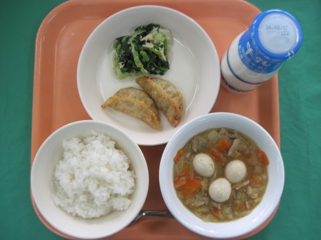 ご飯 牛乳 パリパリ餃子 中華サラダ 八宝菜