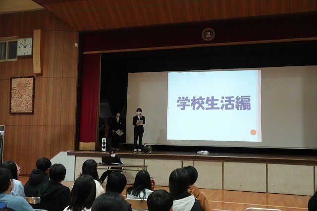 代表生徒から、中学校での学校生活や部活動、授業、定期テスト、学校行事などについて、スライドや寸劇による説明を受けました。