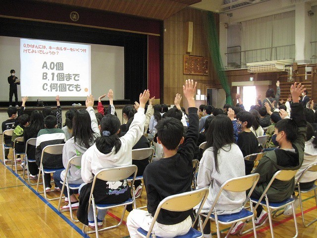 6年生児童は、初めて知る中学校での学校生活の様子や内容について興味深く耳を傾けていました。説明の途中には、学校生活に関連したクイズが出題され、盛り上がる場面もありました。