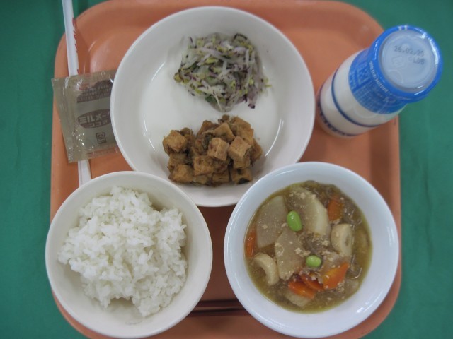 ご飯 牛乳 厚揚げのお好み焼き風 赤しそ和え だいこんのそぼろ煮 ココア牛乳の素