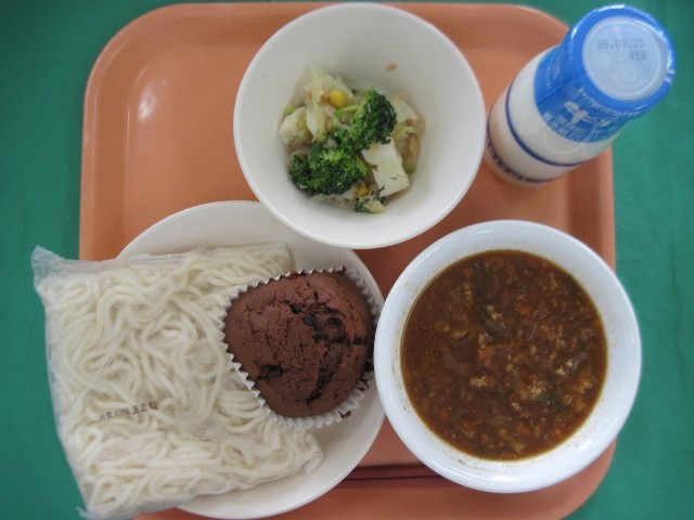 ソフト麺 牛乳 肉味噌タンタン麺の汁 花野菜サラダ 手作りチョコケーキ