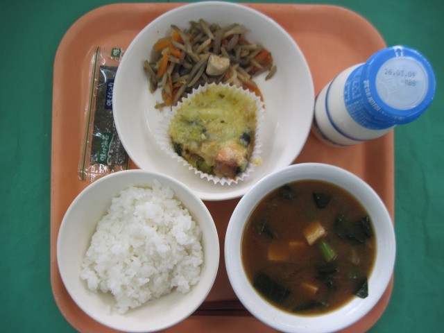 ご飯 牛乳 鮭と野菜のチーズ焼き きんぴらごぼう 厚揚げの味噌汁 味付け海苔