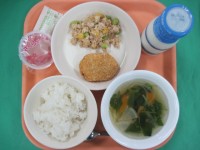 鰆は「魚」へんに「春」と書く、春の訪れを告げる魚ですが、旬は産卵の時期の春(3~5月)と脂がのる冬(12~2月)があります。出来る限り骨がないように切られていますが、骨があるものもあるため、放送で気をつけながら食べるように呼びかけました。1年生も上手に骨を取りながら食べていました。生姜をきかせて下味をつけ、片栗粉で揚げました。食べやすい味で好評でした。
