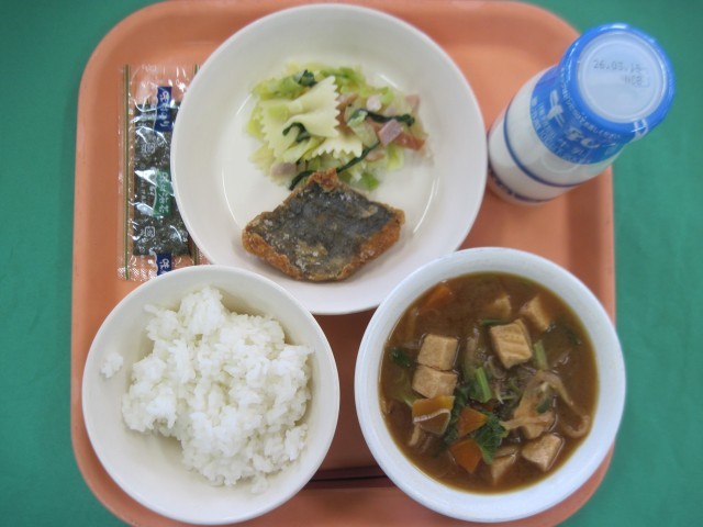 ご飯 牛乳 鰆の竜田揚げ ちょうちょマカロニサラダ 切り干し大根の味噌汁 味付け海苔