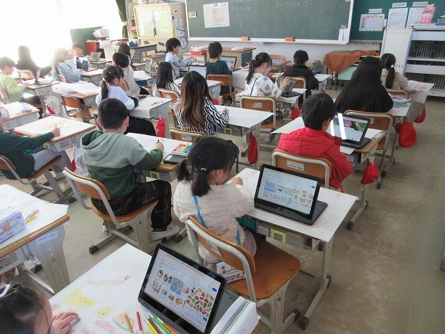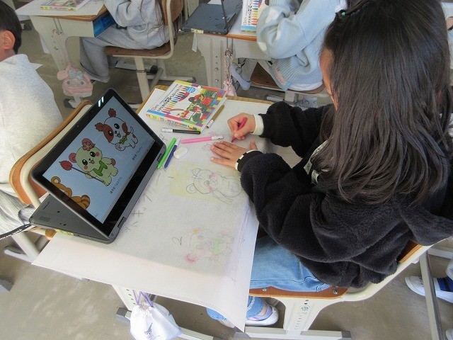 子どもたちは、学習用タブレットで魚や花、食べ物などを検索して、参考にしていました。