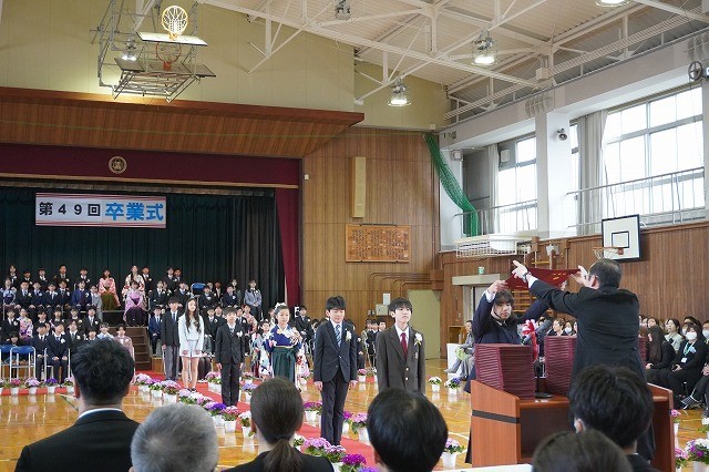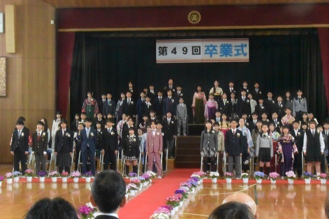 第49回卒業式 その1 公開日 2026/03/19 更新日 2026/03/19 6年生 昨日から天候が心配されましたが、開式前には雨が上がり、卒業式を挙行することができました。卒業生は、緊張しているように見えましたが、立派な姿で式に臨みました。95名の卒業生に卒業証書が授与されました。「巣立ちの詩」では、6年間の学校生活を振り返るとともに、「旅立ちの日に」を合唱しました。卒業おめでとうございます! いいね(0)