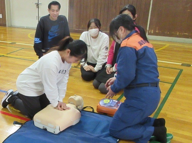 また、AED講習では、海部東部消防署より講師をお招きし、心臓マッサージとAEDの使用方法について丁寧なご指導をいただきました。