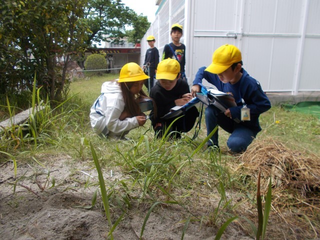 校庭を観察して春にどんな植物や動物がいるのか探しました。3年生で学習した虫眼鏡や温度計を使って観察しています。今後は季節が変わり、気温が変わると同じ場所にどんな植物や動物がいるのかを観察する予定です。見つけた花や昆虫、木の枝にできていた鳥の巣は2か月ほど後にはどうなっているのでしょうか。