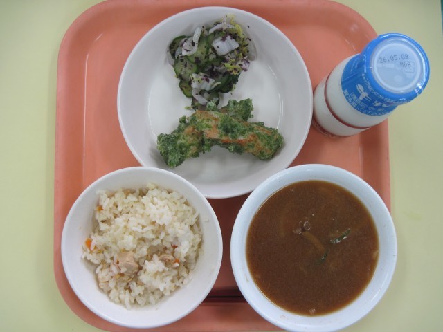4/28 今日の献立 公開日 2026/04/28 更新日 2026/04/28 今日の献立 鶏飯 牛乳 ちくわの磯辺揚げ 赤しそ和え 豚汁 ちくわの磯辺揚げは天ぷら粉に青のりと少量の塩を混ぜた衣をちくわにつけ、からっと揚げました。青のりの磯の風味がよく、色も鮮やかな緑色に仕上がりました。子どもに「ちくわがなにからできているか知ってる?」と聞くと、元気よく「魚!」と答えていました。「白身の魚だよ」と伝えると「○○は白身魚?」と様々な魚の名前を挙げていました。 いいね(0)
