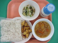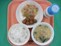ご飯 牛乳 肉団子の甘酢あんかけ 炒めビーフン スタミナ汁 甘酢ダレはケチャ...