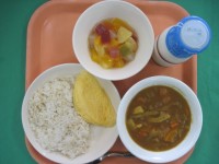 ロウカット玄米ご飯 牛乳 根菜チキンカレー オムレツ カラフルゼリーポンチ ...