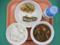 ご飯 牛乳 焼き餃子 バンサンスー 麻婆豆腐 今日は無事スポーツフェスティバ...