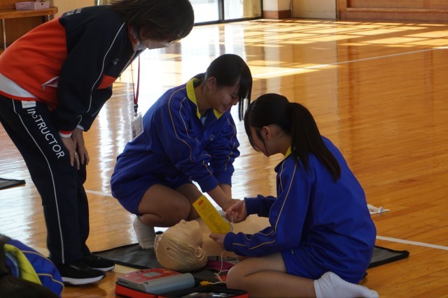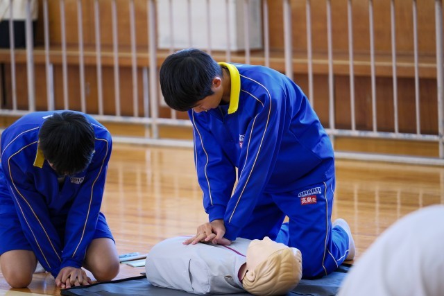 心肺蘇生法やAEDの使い方を学び、真剣な表情で取り組む姿が見られました。