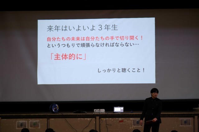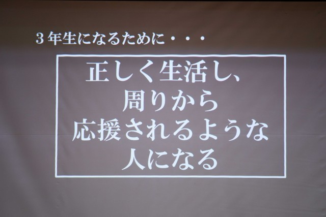 集会では、3年生になるにあたって、勉強と同じくらい大切なこととして「正しく生活し、周りから応援される人になること」の重要性について考えました。