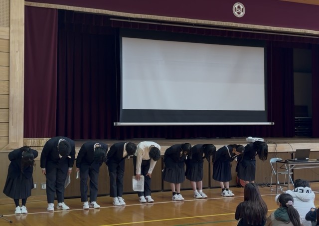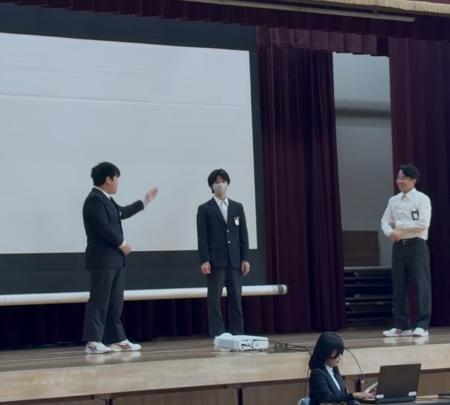 中学校の授業、休み時間の過ごし方、部活動、学校行事などについて、劇やクイズを取り入れながら、楽しく伝えました。